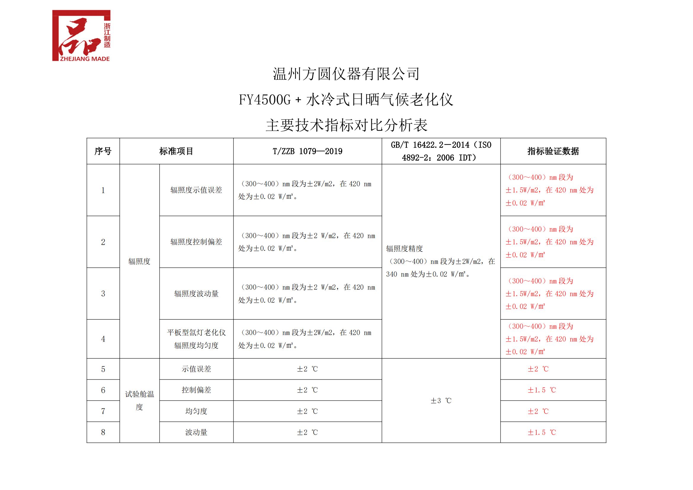 FY4500G﹢水冷式日曬氣候老化儀主要技術指標對比分析表